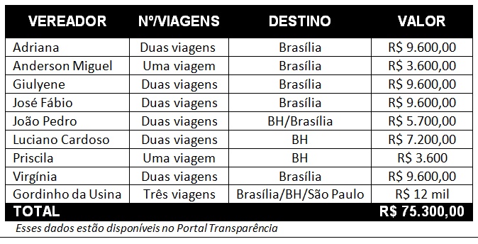 Só nesse período, a Câmara já pagou R$ 75,3 mil em diárias aos vereadores. O campeão com três viagens foi Werner Aparecido, o Gordinho da Usina (PDT). Nesses 26 dias ele faturou R$ 12 mil só em diárias. Veja no quadro abaixo, os valores recebidos pelos oito vereadores que viajaram nesse período: