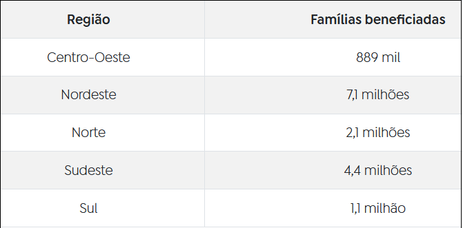 Hoje, a Região Nordeste concentra o maior número de famílias contempladas. A estimativa é que mais de 7,1 milhões de famílias nordestinas sejam atendidas. Na sequência aparecem Sudeste (4,4 milhões), Norte (2,1 milhões), Sul (1,1 milhão) e Centro-Oeste (889 mil).