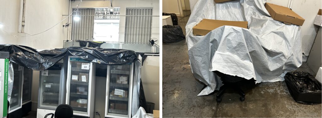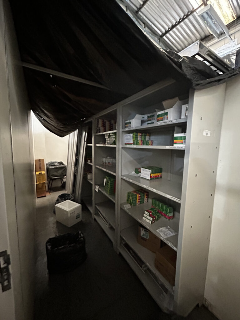 “Encontramos uma situação preocupante, com muitas goteiras, vazamentos, medicamentos e equipamentos em risco. A situação só não está pior porque os servidores buscaram soluções paliativas, como cobrir os materiais com lonas e usar baldes para conter goteiras. Ainda assim, havia água da chuva em parte do piso e pontos de energia estavam molhados, causando preocupação até mesmo de um curto circuito”, conta Lucilândia Monteiro.